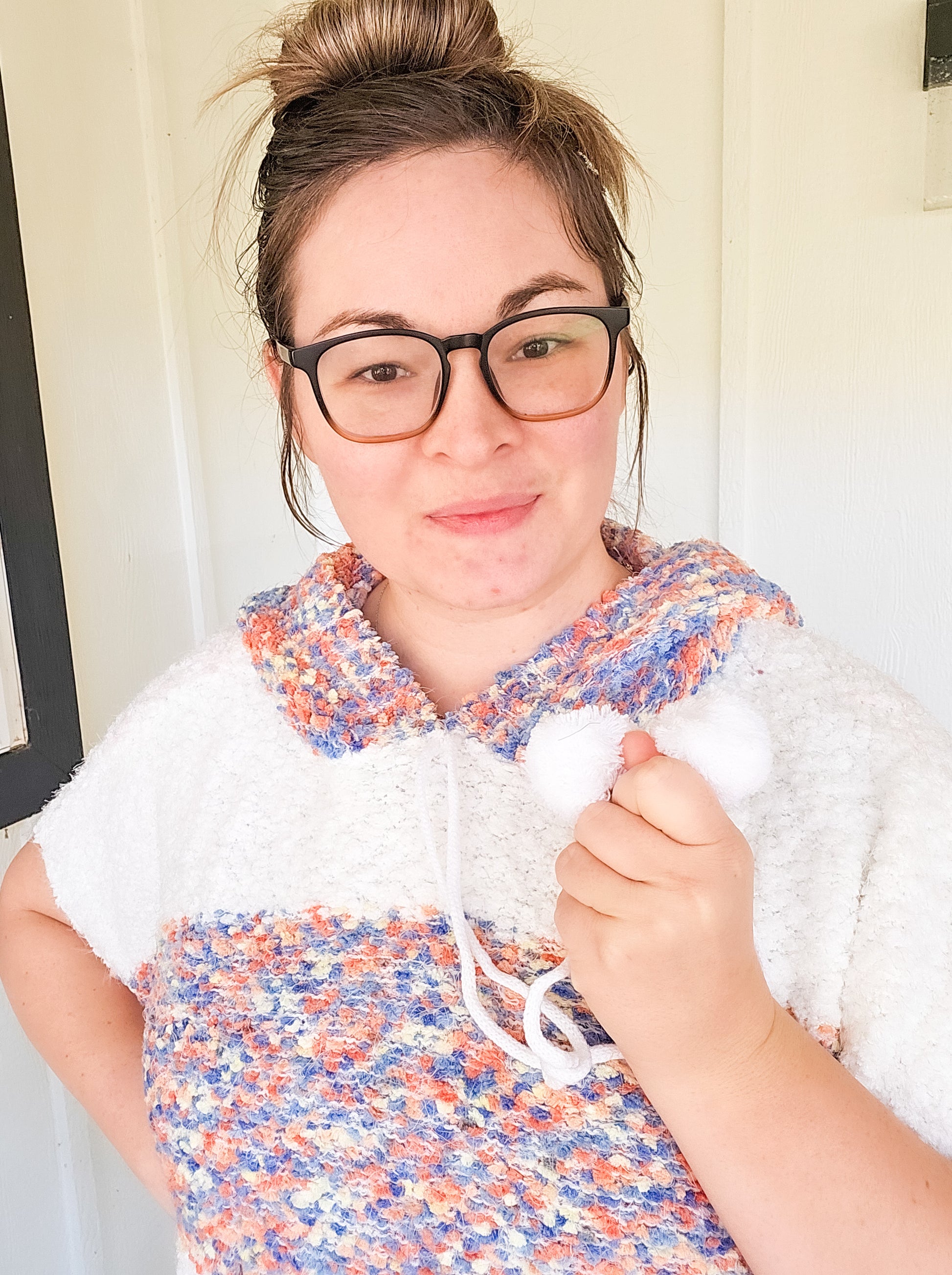 This poncho is like a cozy blanket with the bonus of a hood β the perfect combination of comfort and style! An excellent transition piece for fall and spring, it effortlessly transforms into a winter staple by layering it with a long-sleeved undershirt. The classic wide stripe pattern is made modern by the fun blue and pink print to offset the sleek white. Whether you choose jeans or leggings, this fun and versatile top is a stylish choice. And let's not forget the added comfort of the side slit! Did I mention the hood? This top is the ultimate multitasker, ensuring you're covered in both fashion and functionality!